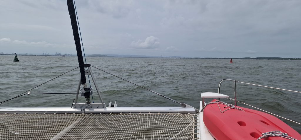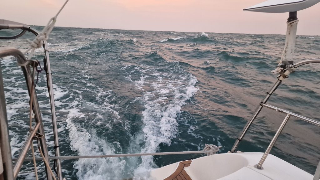 Nous avançons bien moins vite mais sommes toujours à la voile. Nous n’allumerons les moteurs que 2h avant l’arrivée.