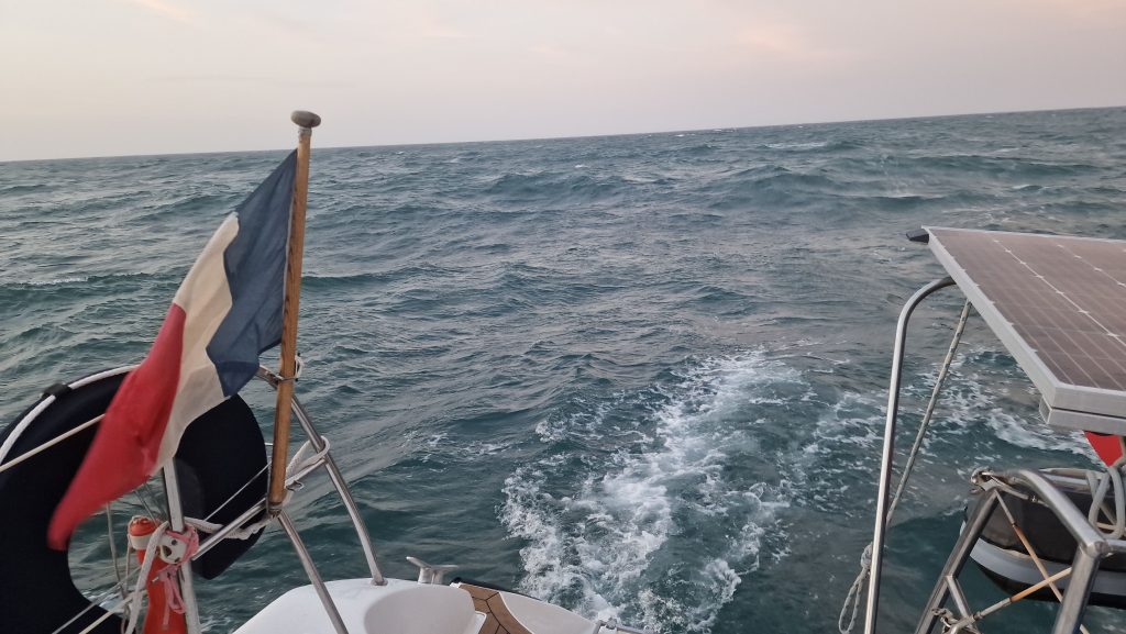 Nous avons rentré le génois et avons ajouté 1 ri à la grand voile. Nous avançons quand même entre 5 et 6 nœuds.
