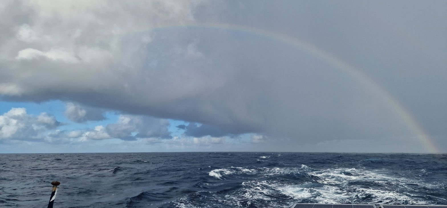 Nous sommes plein vent arrière, voiles en ciseaux. L’allure est très confortable et nous ne ressentons que peu le vent, dont les rafales atteignent pourtant plus de 30 nœuds.